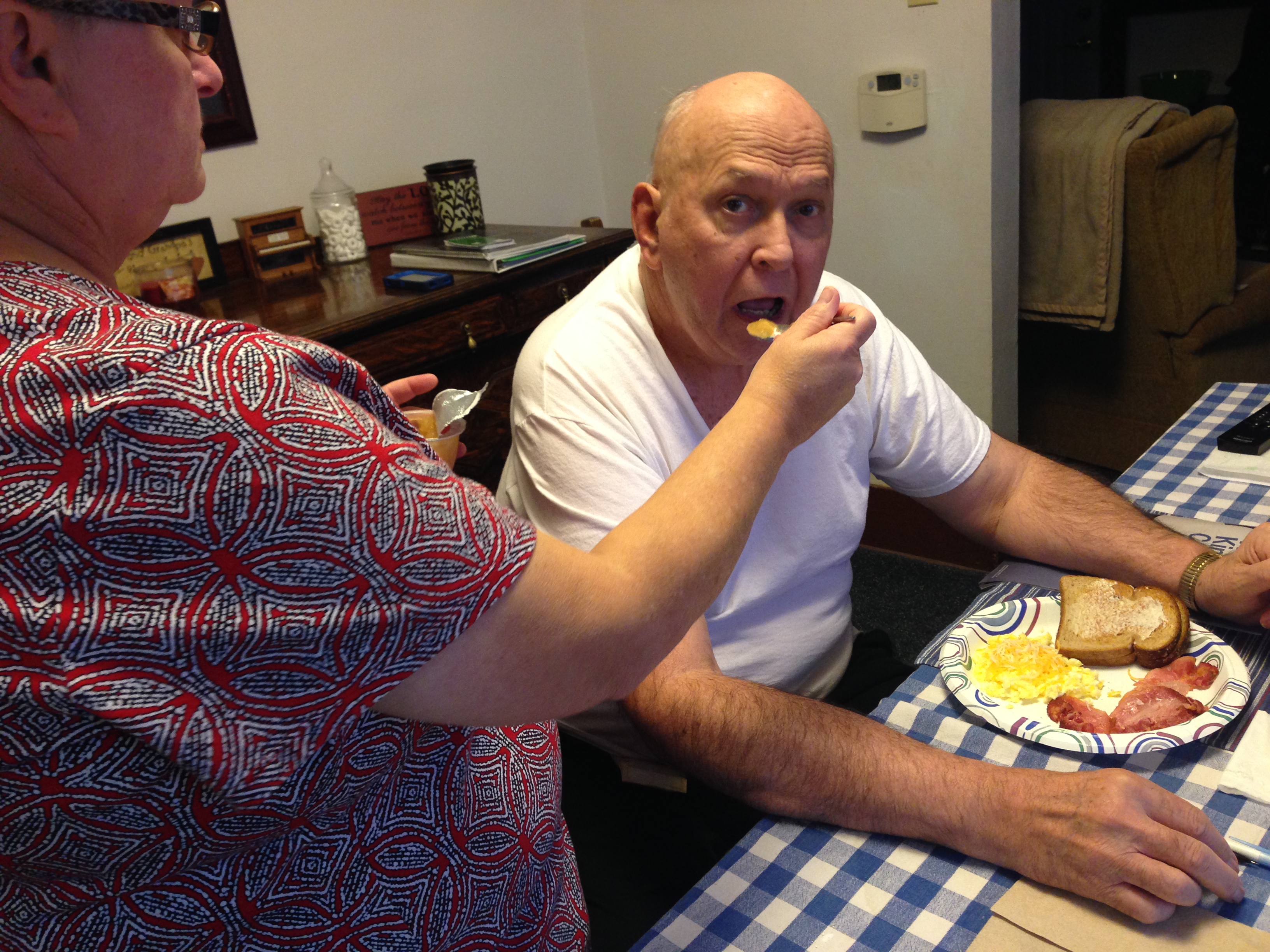 Giving Roger medicine with applesauce