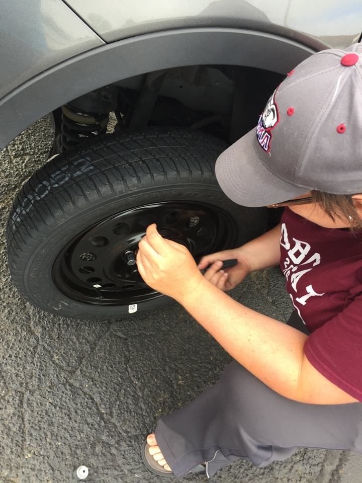 Lisa changes the tire